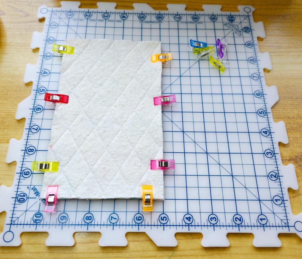 To fix the layers together and prevent shifting you can use fabric clips or pins, I decided to skip this step though.