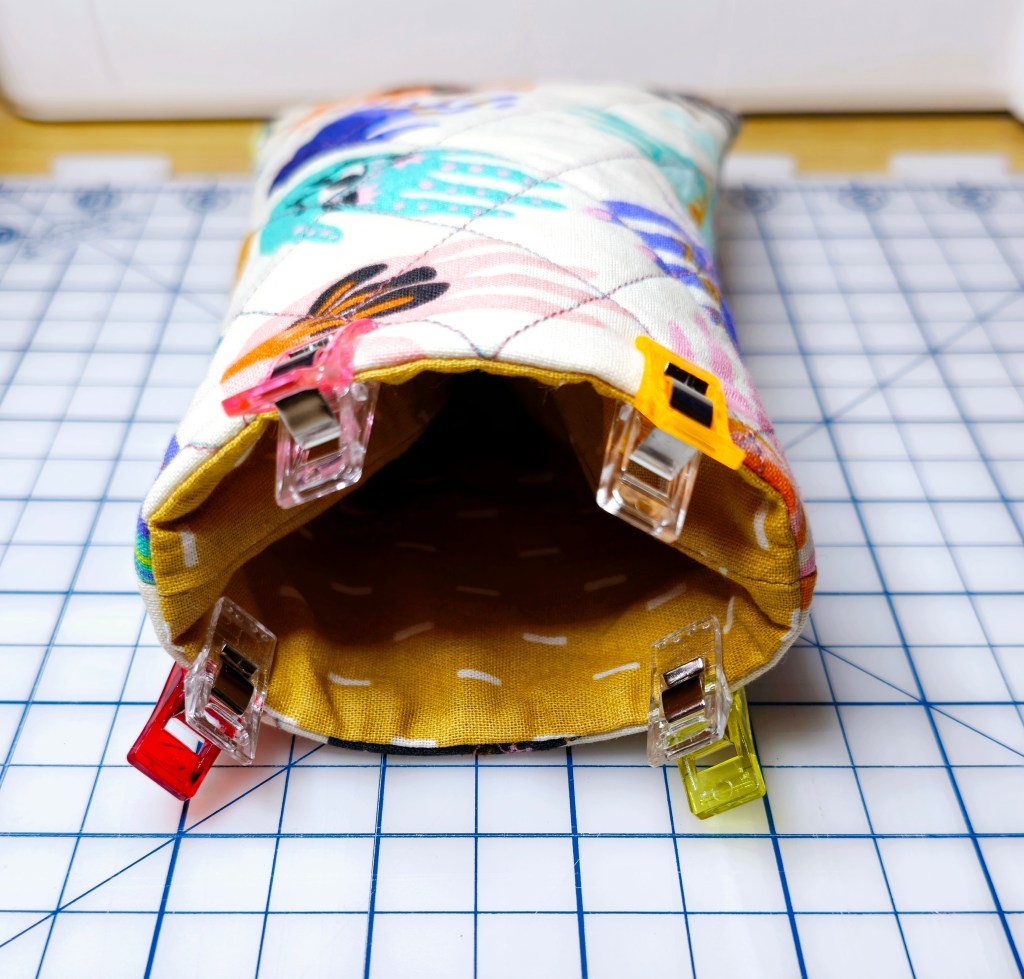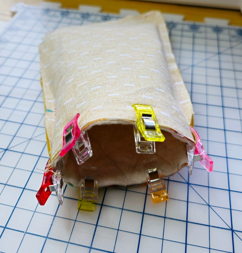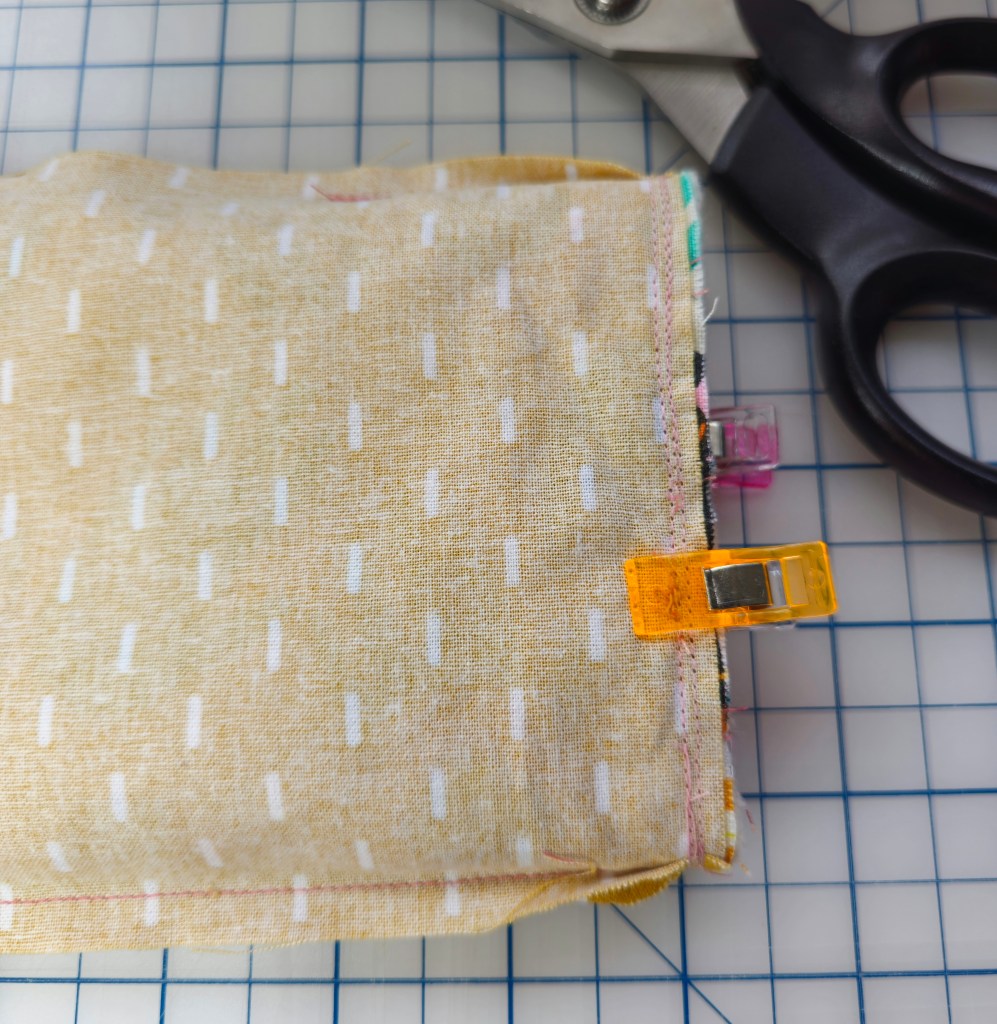 Then line up the seams of the interior and exterior panels, using fabric clips to hold the seams together. Make sure your side seams are aligned on both sides.