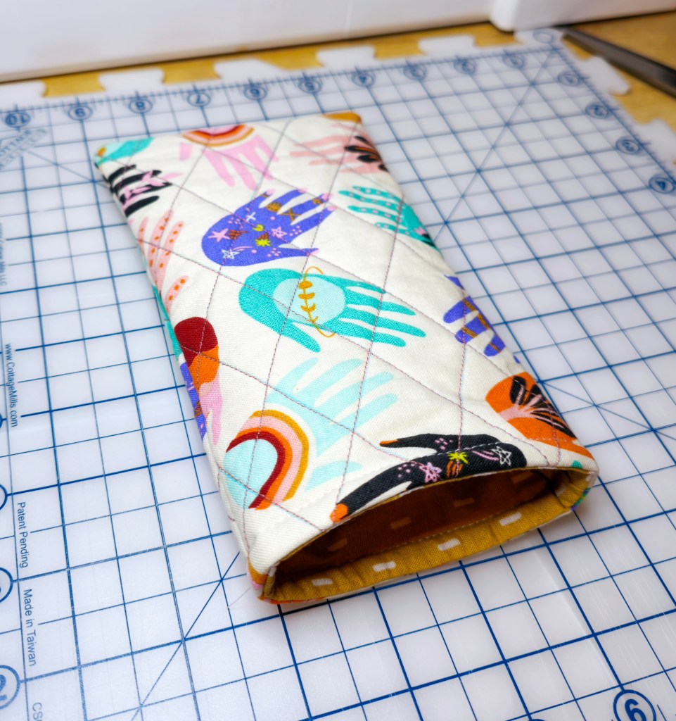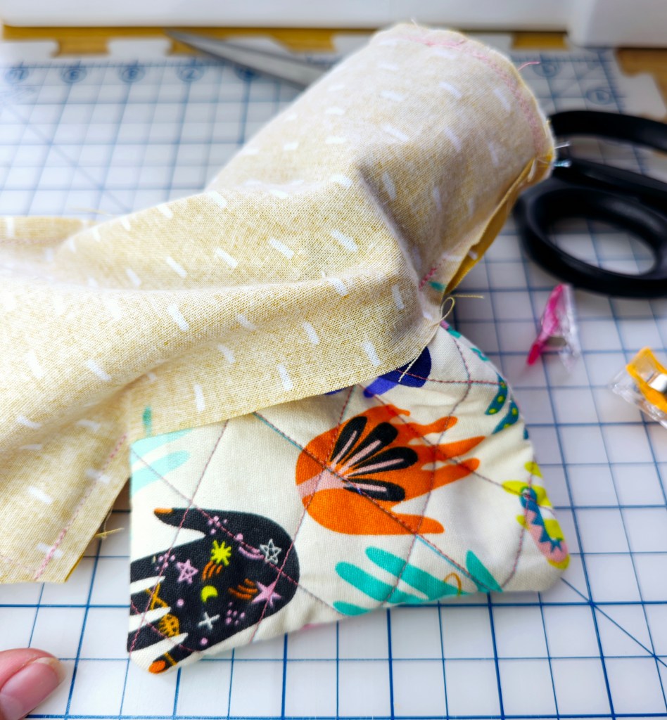Take your quilted burrito to the sewing machine and sew all the layers together, this time using a ½” seam allowance.