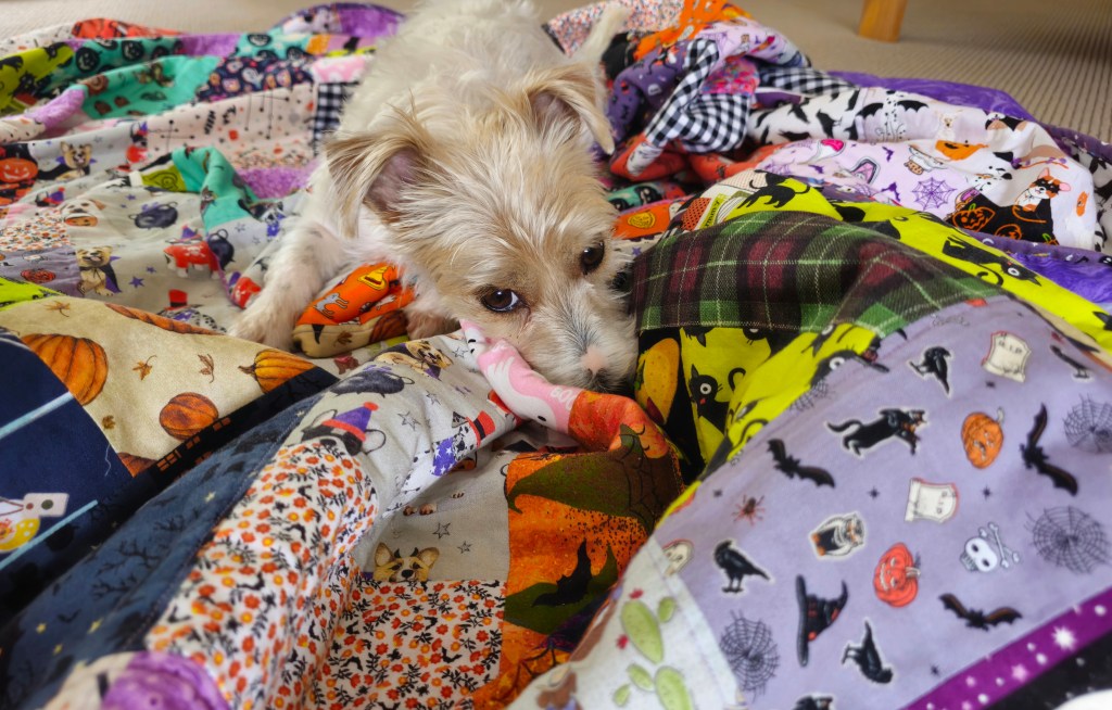 The ‘Spooktacular Treats’ quilt now lives with my sister, not only does she love it but her best friend Ellie does too! Ellie doesn’t like me unless I’m giving her treats, I had to bribe her to be in these pictures. After far too many treats I finally snapped a few pictures of her enjoying the quilt.